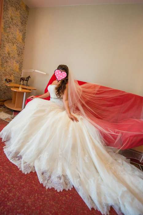 шлейф 2 м, итальянское кружево. А-силуэт. Цвет айвори светлый. Платье без колец, ходить обалденно удобно ! Юбка не мешает и не путается между ног ! Меня пугали, что я запарюсь со шлейфом, но это точно не про это платье! Он нисколько не мешает! Корсет на шнуровке. Подойдет на грудь 86-100. Платье после химчистки как новое.